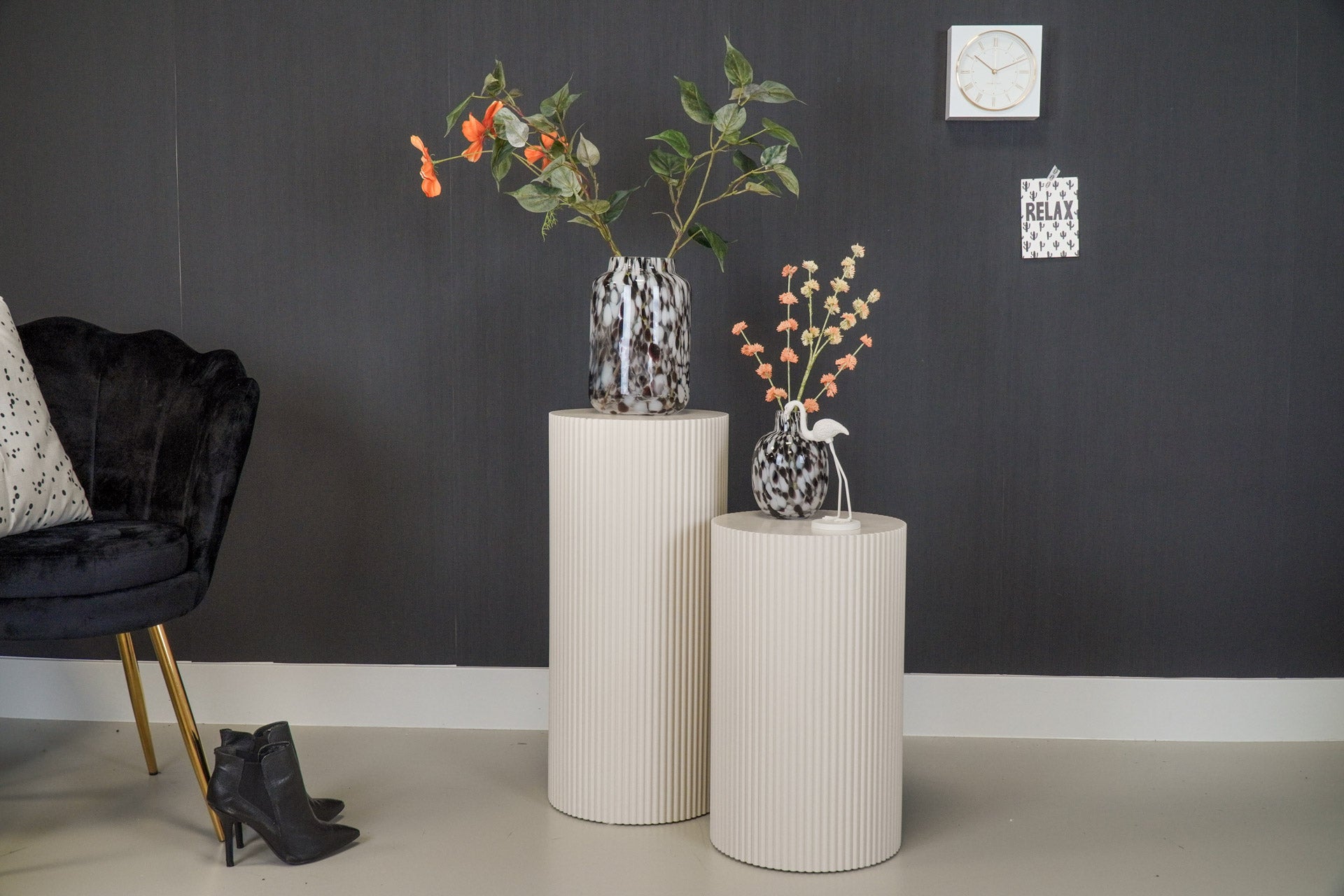 PILAAR BIJZETTAFEL - Planten en andere objecten verdienen het om te shinen, dus geef ze alsjeblieft een podium! Met deze geribbelde cilinders geef je jouw mooie items echt een podium. Dit formaat cilinder kan als pilaar of bijzettafel worden gebruikt. Jij beslist!