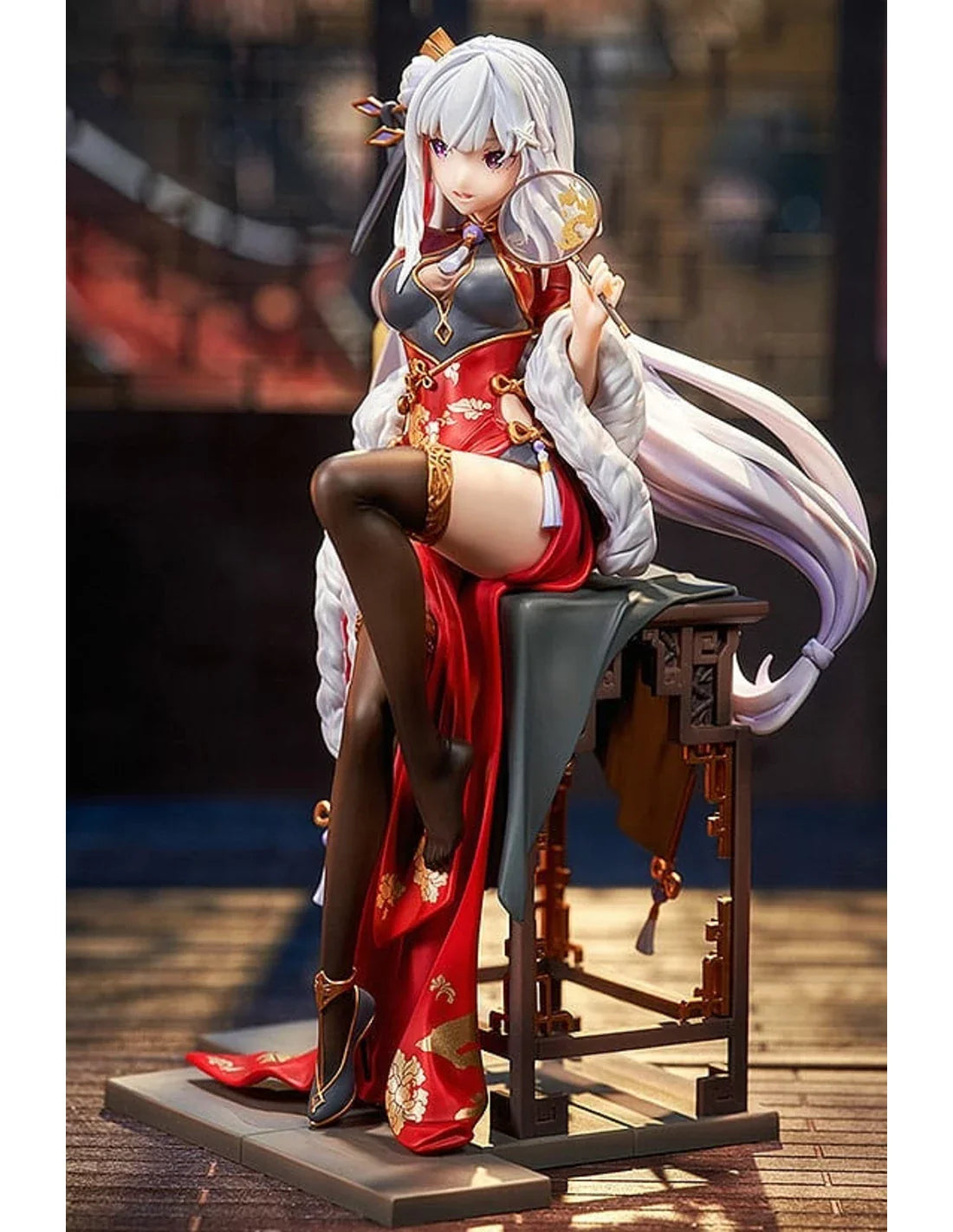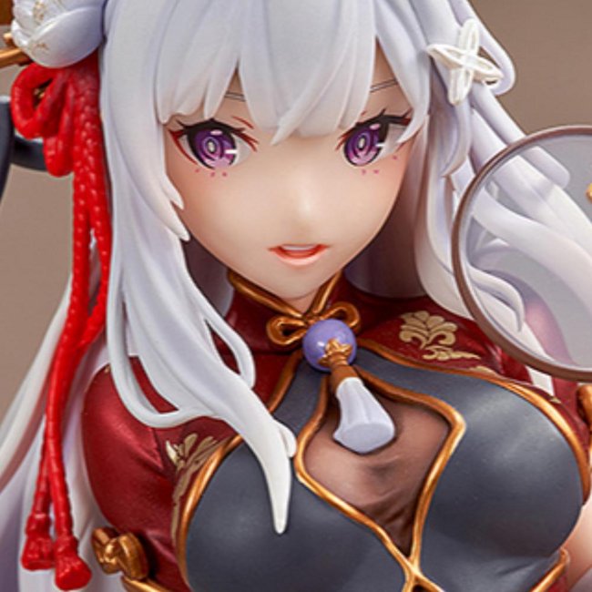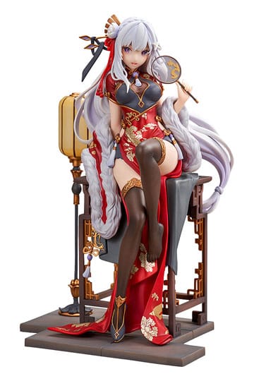 Met een totale hoogte van ongeveer 24 cm, zit Emilia gracieus op een gedetailleerde, traditionele stoel. Ze draagt een schitterende rode jurk, geïnspireerd op een Chinese cheongsam, met prachtige gouden bloemmotieven, een zachte bontkraag en elegante zwarte kousen. In haar hand houdt ze een sierlijke waaier vast, en haar zilveren haar is prachtig opgestoken. Elk detail, van de textuur van haar kleding tot de zachte blik in haar ogen, is met uitzonderlijk vakmanschap vormgegeven. Een absoluut meesterwerk en een pronkstuk voor elke Re:Zero fan en verzamelaar van hoogwaardige schaalfiguren!