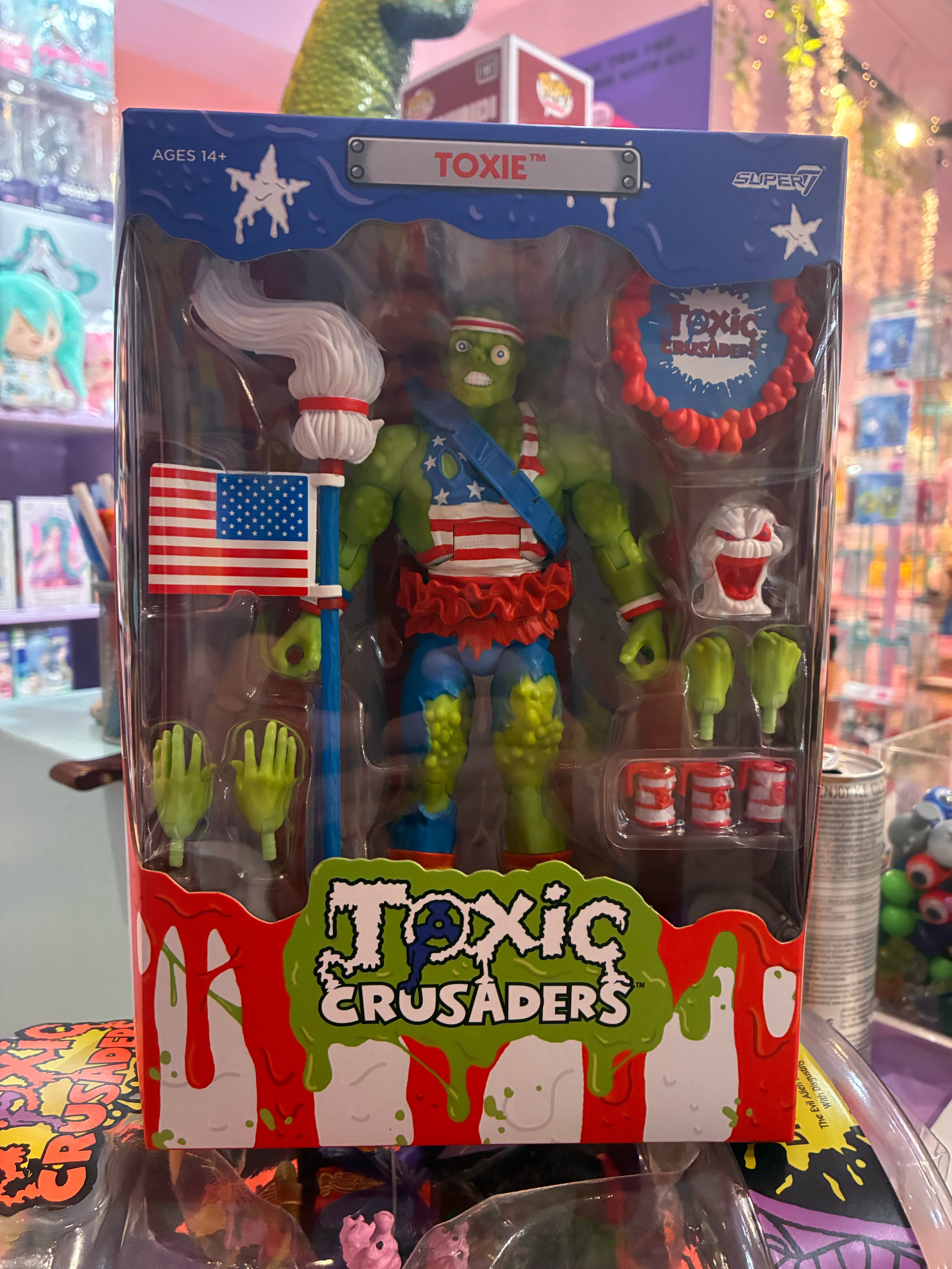 Hij is hier om Amerika op te ruimen, één vervuiler per keer! De superheld van het afval, Toxie, is terug en vaderlandslievender dan ooit in deze spectaculaire ULTIMATES! uitgave van Super7. Dit is niet zomaar een actiefiguur; het is de realisatie van een legende! Het ontwerp is geïnspireerd op de nooit eerder uitgebrachte vintage "mail-away" actiefiguur, een heilige graal voor verzamelaars. Nu, voor het eerst, kan dit stukje speelgoedgeschiedenis van jou zijn, compleet met een overvloed aan accessoires.